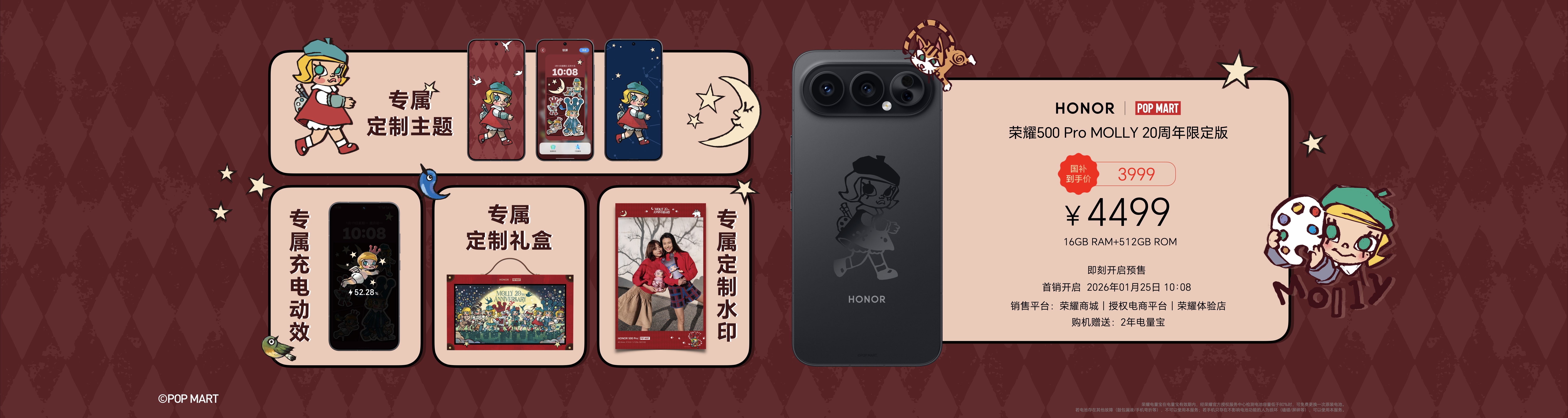 价格方面,荣耀Magic8 RSR保时捷设计定制版7999起,荣耀Magici8 Pro Air4999起,荣耀500 Pro MOLLY 20周年限定版4499元,国补后价格为3999元。