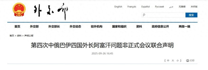 26日我国外交部发布声明称,应俄罗斯邀请,中国、俄罗斯、巴基斯坦和伊朗四国在联大会议期间讨论了阿富汗问题和当前局势,并达成一系列共识。